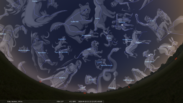 Höher am Himmel steht Jupiter, größter Plandet des Sonnensystems, als heller "Stern" im Sternbild Zwillinge. Anfang April geht Jupiter gegen 4.00 Uhr morgens unter, Ende April gegen 2.00 Uhr.