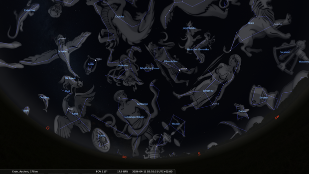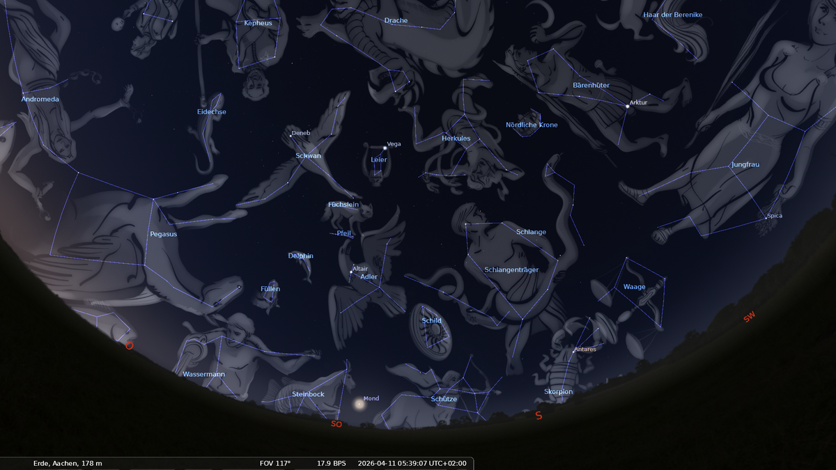 Über dem östlichen Horizont sehen wir die Sommersternbilder Adler, Leier und Schwan.