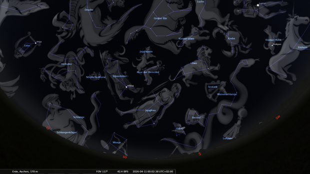 Im Südosten geht der Skorpion auf. In unseren Breiten steigt er nie ganz über den Horizont. Erst von südlicheren Gegenden aus, wie Südeuropa, ist er vollständig zu sehen.