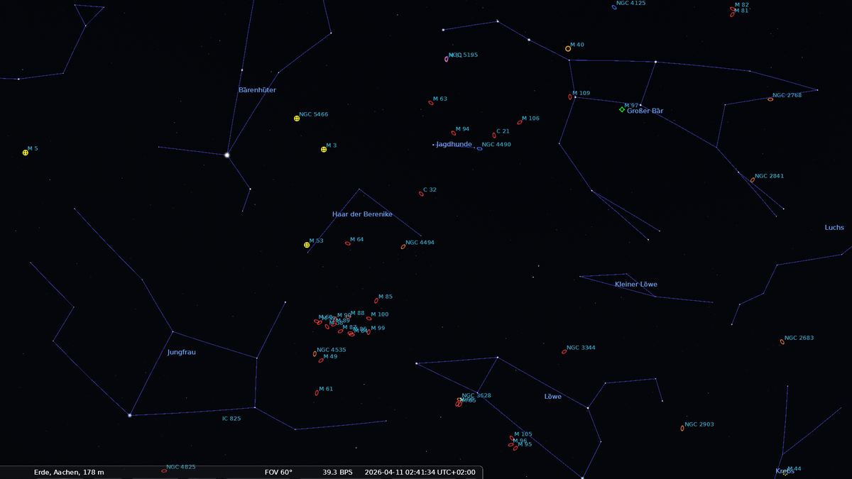 Die Galaxien, die wir in Richtung Löwe, Jungfrau und Haar der Berenike sehen, sind mindestens 20 Millionen Lichtjahre entfernt. Mit bloßem Auge sind sie nicht erkennbar aber bereits im Fernglas werden sie als neblige Fleckchen sichtbar.