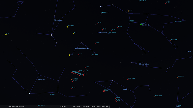 In der Gegend um die Sternbilder Löwe, Jungfrau und Haar der Berenike sind zahlreiche Galaxien sichtbar. Galaxien sind riesige Ansammlungen von hunderten Milliarden Sternen. Die "Milchstraße", die wir nachts sehen, ist eine solche Galaxie. Unsere Sonne ist einer von etwa 200 Milliarden Sternen, aus denen die Michstraße besteht.