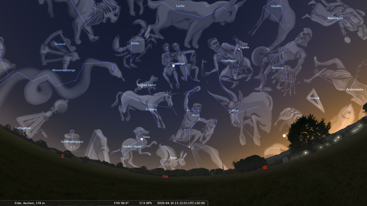 In südlicher Richtung sehen wir noch die auffallenden Wintersternbilder Orion, Zwillinge und Großer Hund.
