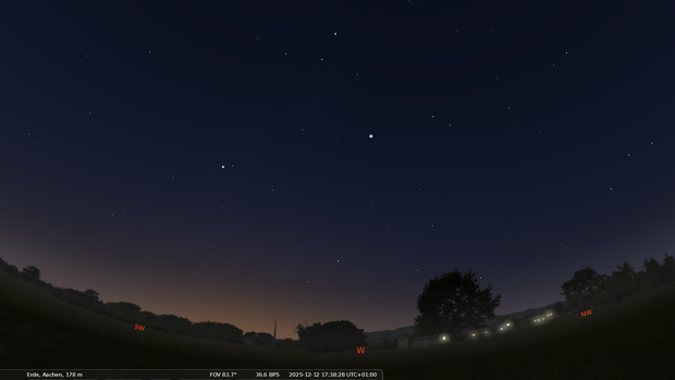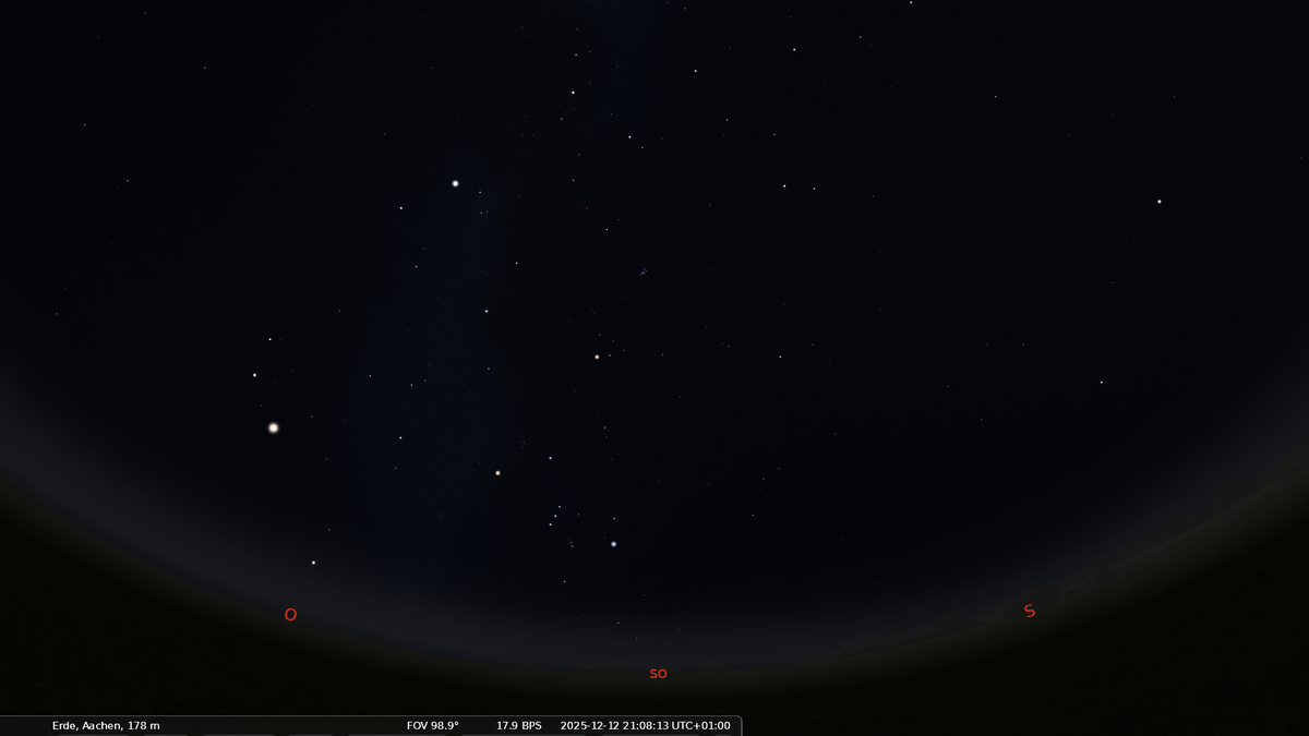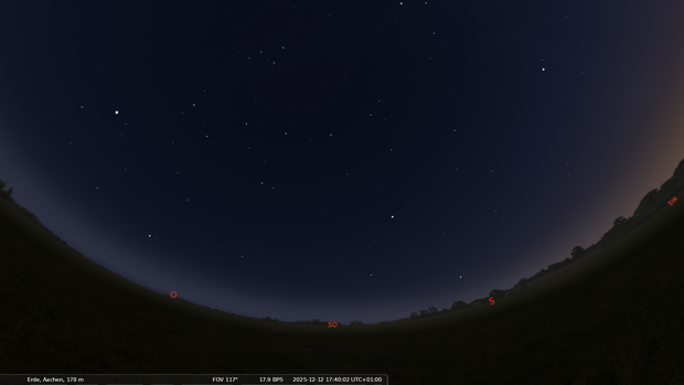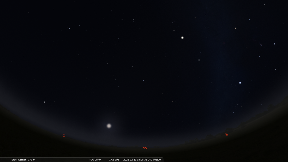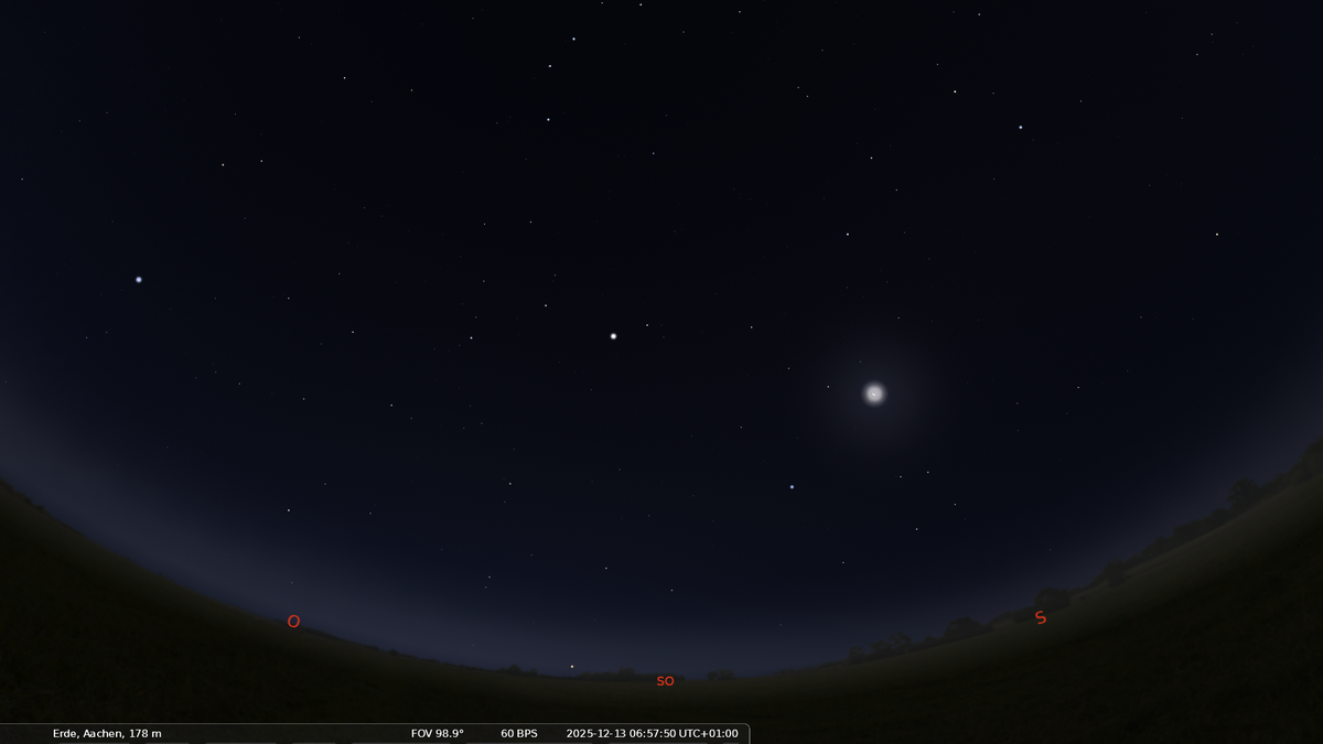Eine Stunde vor Sonnenuntergang geht der Planet Merkur auf. Der innerste Planet des Sonnensystems bewegt sich - von der Erde aus gesehen - immer in der Nähe der hellen Sonne und ist schwierig zu beobachten. Von Anfang bis Mitte Dezember wird Merkur sichtbar. Er ist mit bloßem Auge sichtbar, jedoch in der hellen Dämmerung etwas schwierig zu entdecken. Mit einem Fernglas ist er leicht zu finden.