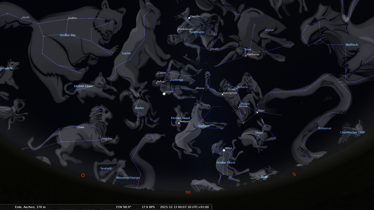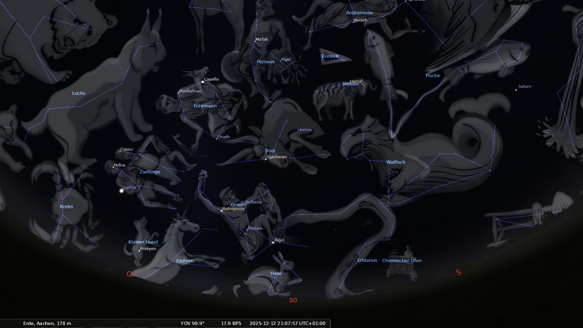 Durch die Zwillinge zieht der Planet Jupiter. Der größte Planet des Sonnensytems ist auffallend hell und derzeit nach Sonne und Mond das hellste natürliche Objekt am Himmel.