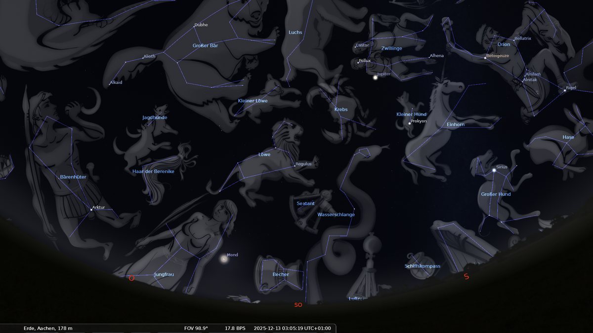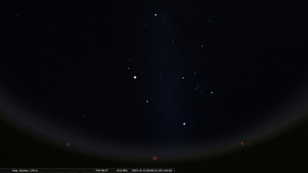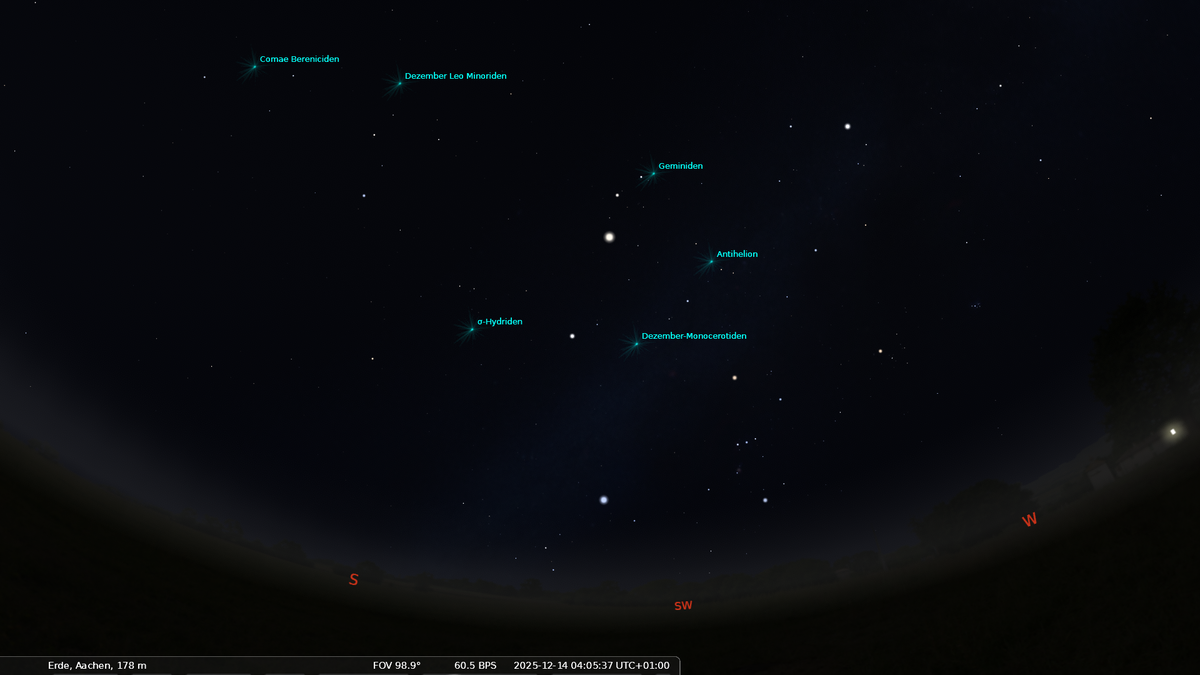 Das Maximum des Meteorstroms wird in der Nacht vom 13. auf den 14. Dezember erreicht. Theoretisch sind dann bis zu 150 Meteore pro Stunde sichtbar. Praktisch werden es sehr viel weniger sein, da in diesem Jahr der Mond mit seinem hellen Licht die Beobachtung beeinträchtigt.
