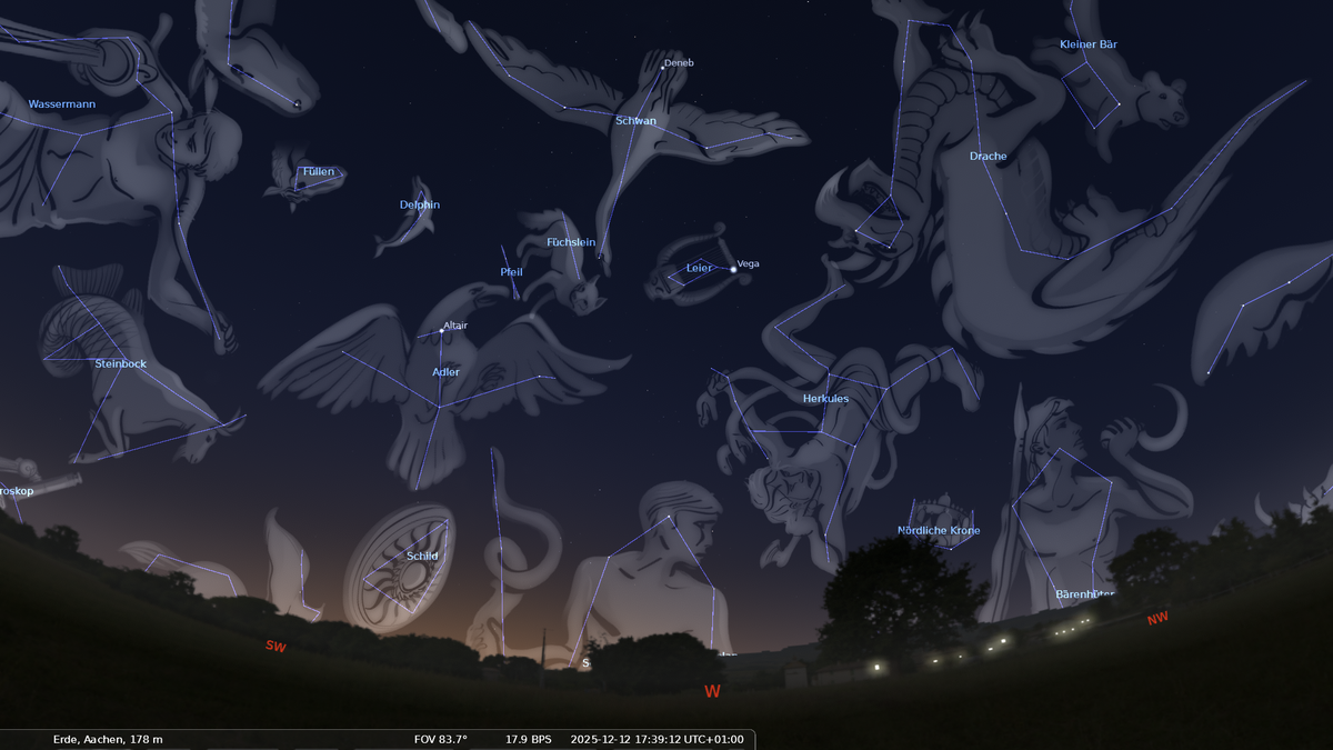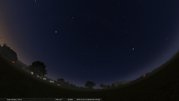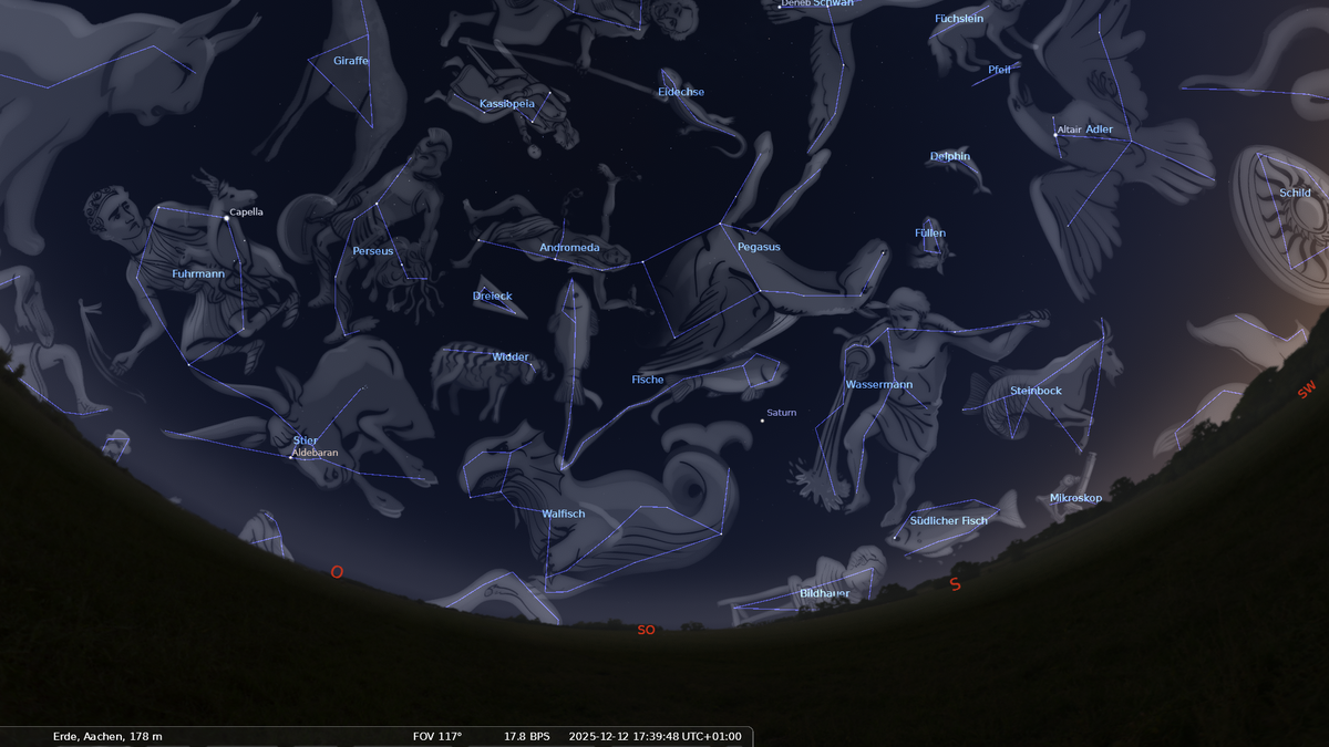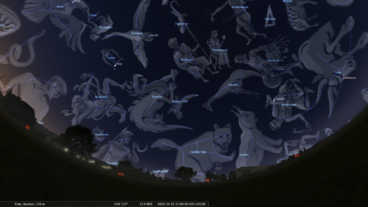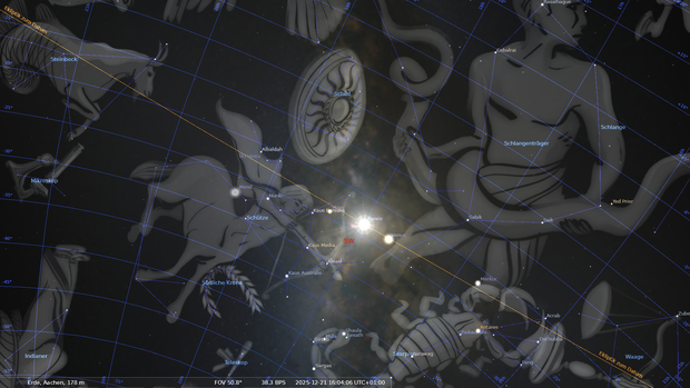 Am 21.12.2025 durchläuft die Sonne den tiefsten Punkt ihrer (scheinbaren) Bahn am Himmel. Dies ist der Zeitpunkt der Wintersonnenwende. Die Sonne befindet sich dann in Richtung des Sternbildes Schütze.
