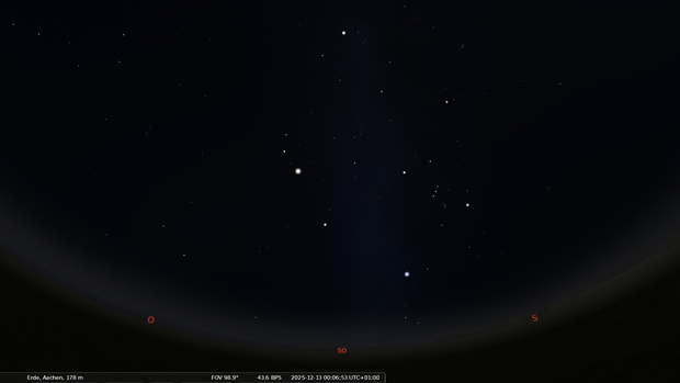 Über dem südöstlichen Horizont steht Orion, der Jäger aus der griechischen Sage. Orion ist an seinen drei "Gürtelsternen" leicht zu erkennen und eines der markantesten Sternbilder. Auffallend hell sind die rötliche Beteigeuze in der Schulter des Orion und der blauweiße Rigel im Fuß.