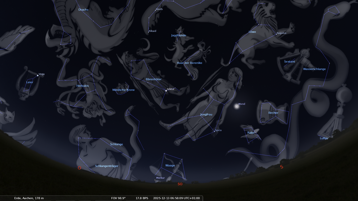 Am 13. Dezember sehen wir den abnehmenden Halbmond im Sternbild Jungfrau.