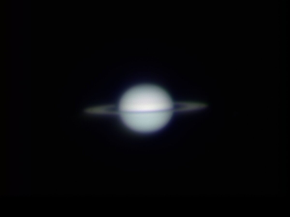 Zur Zeit blicken wir ziemlich genau in die Äquatorebene des Saturn. Die Ringe sehen wir daher als schmalen Strich.