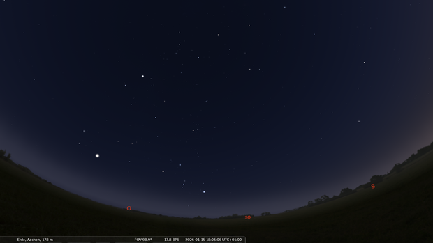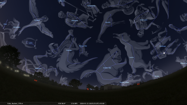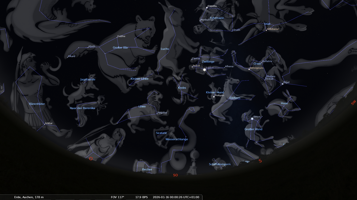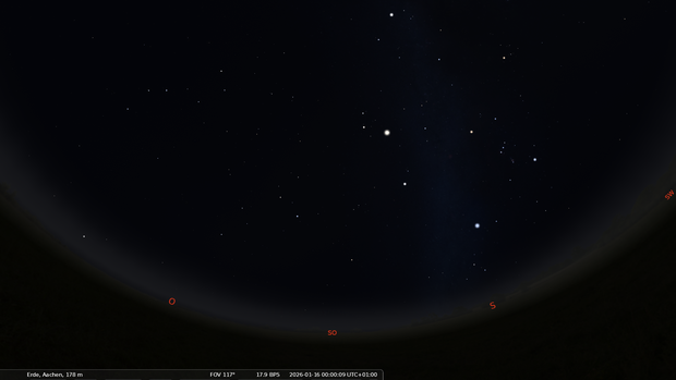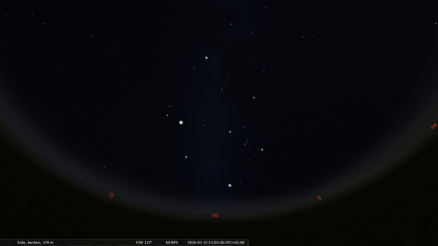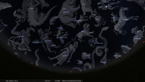 Im Osten geht das Frühjahrsternbild Jungfrau auf. Darüber stehen Löwe und Krebs.
