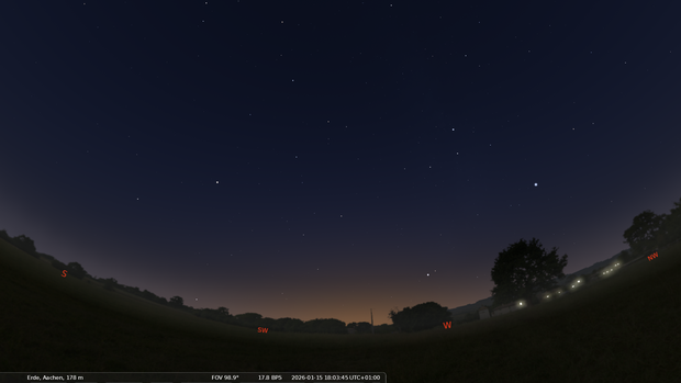 Hier ist eine Übersicht über das Geschehen am Himmel in diesem Monat. Die Darstellungen des Himmels wurden mit der Freeware Stellarium erstellt. Die Fotos der Planeten entstanden an der Sternwarte Aachen. Durch Klicken auf die Abbildungen werden diese vergrößert.