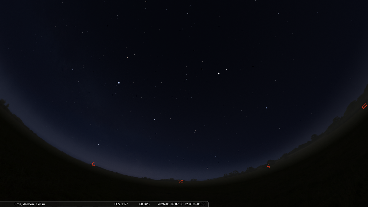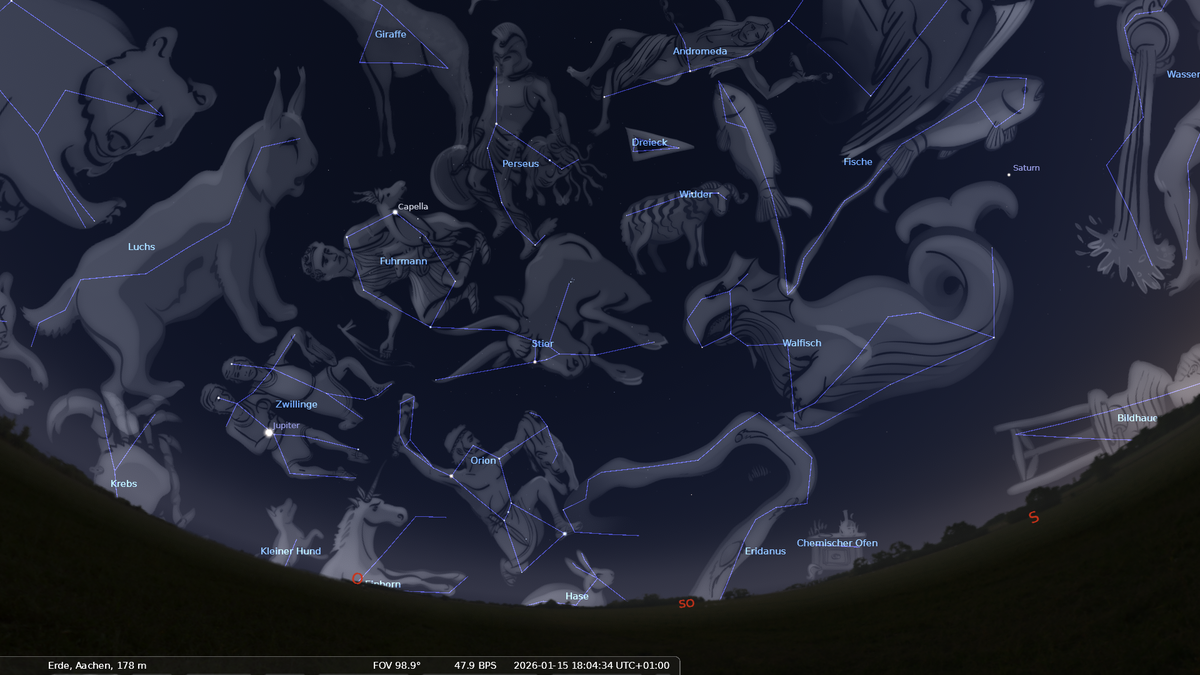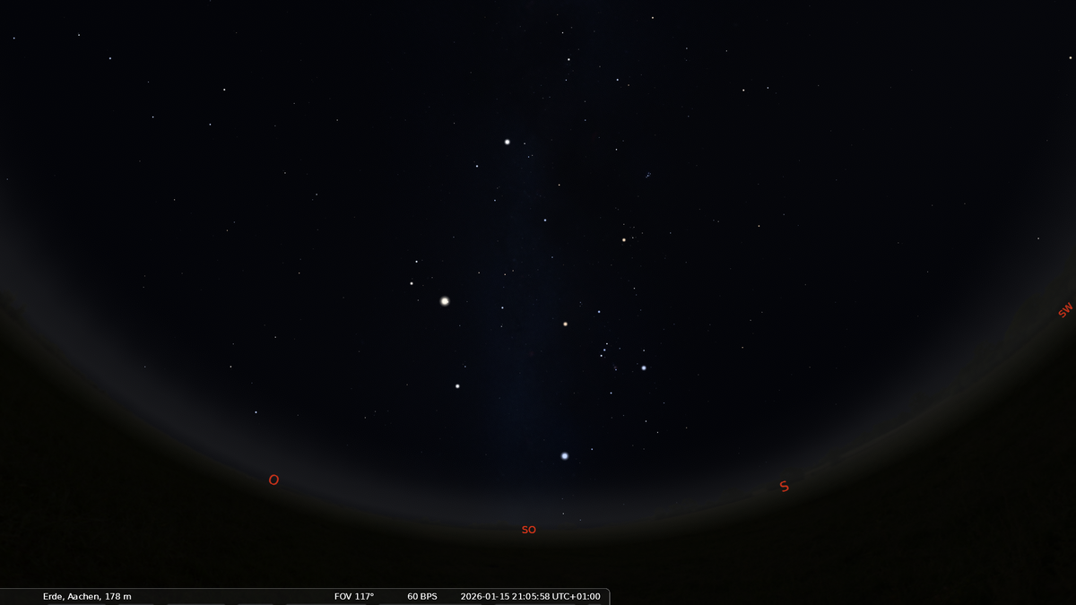 Über dem südöstlichen Horizont steht Orion, der Jäger aus der griechischen Sage. Orion ist an seinen drei "Gürtelsternen" leicht zu erkennen und eines der markantesten Sternbilder. Auffallend hell sind die rötliche Beteigeuze in der Schulter des Orion und der blauweiße Rigel im Fuß.