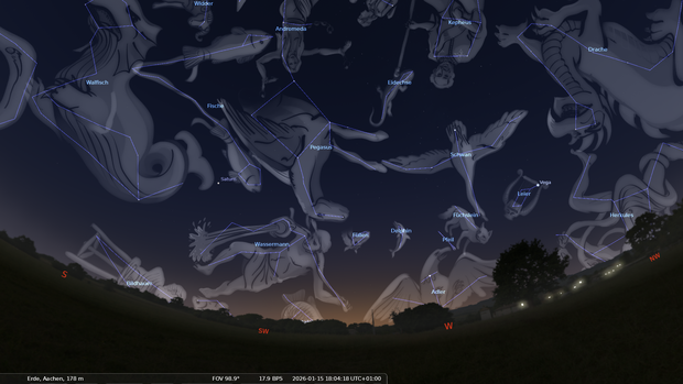 Im Südwesten gehen Wassermann und Fische unter. Darüber steht das große Rechteck des Pegasus.