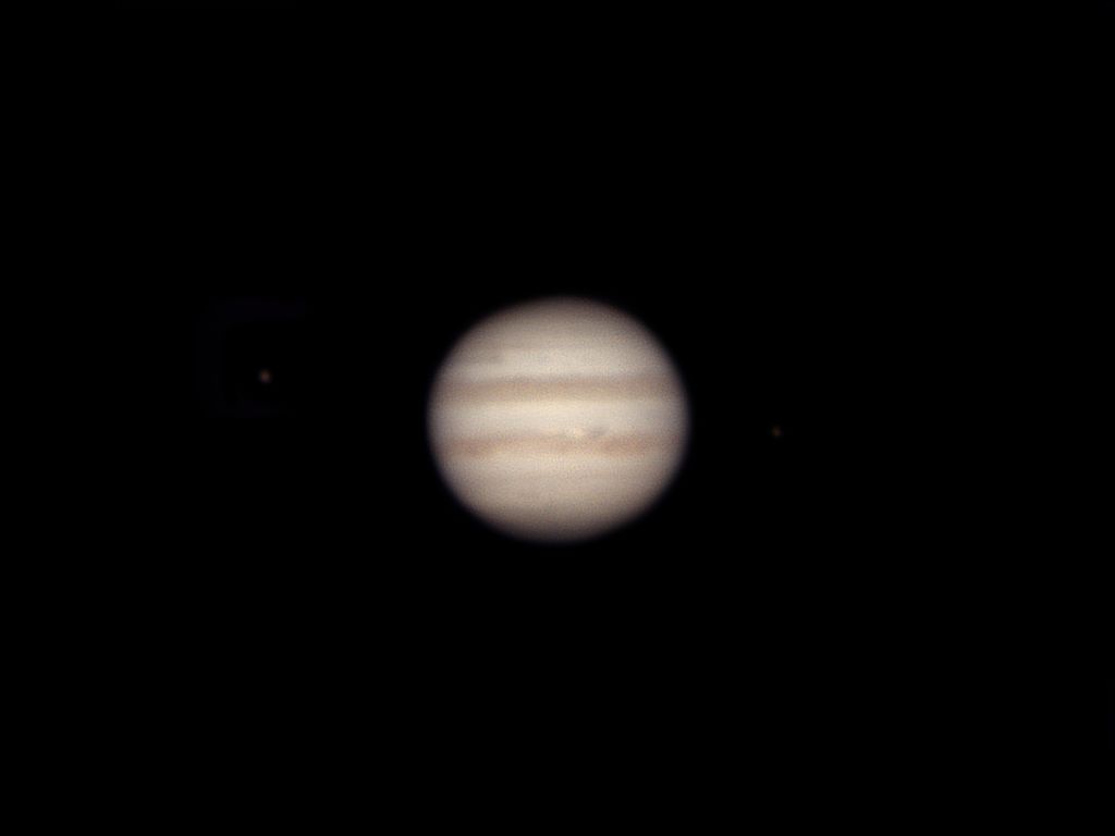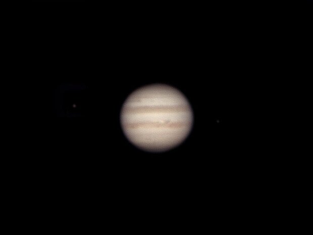 Die am 30. Dezember 2025 gemachte Aufnahme zeigt zwei dunkle Wolkenbänder. Links von Jupiter ist der helle Mond Europa, rechts der Mond Io zu sehen.