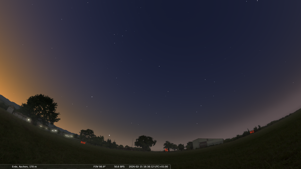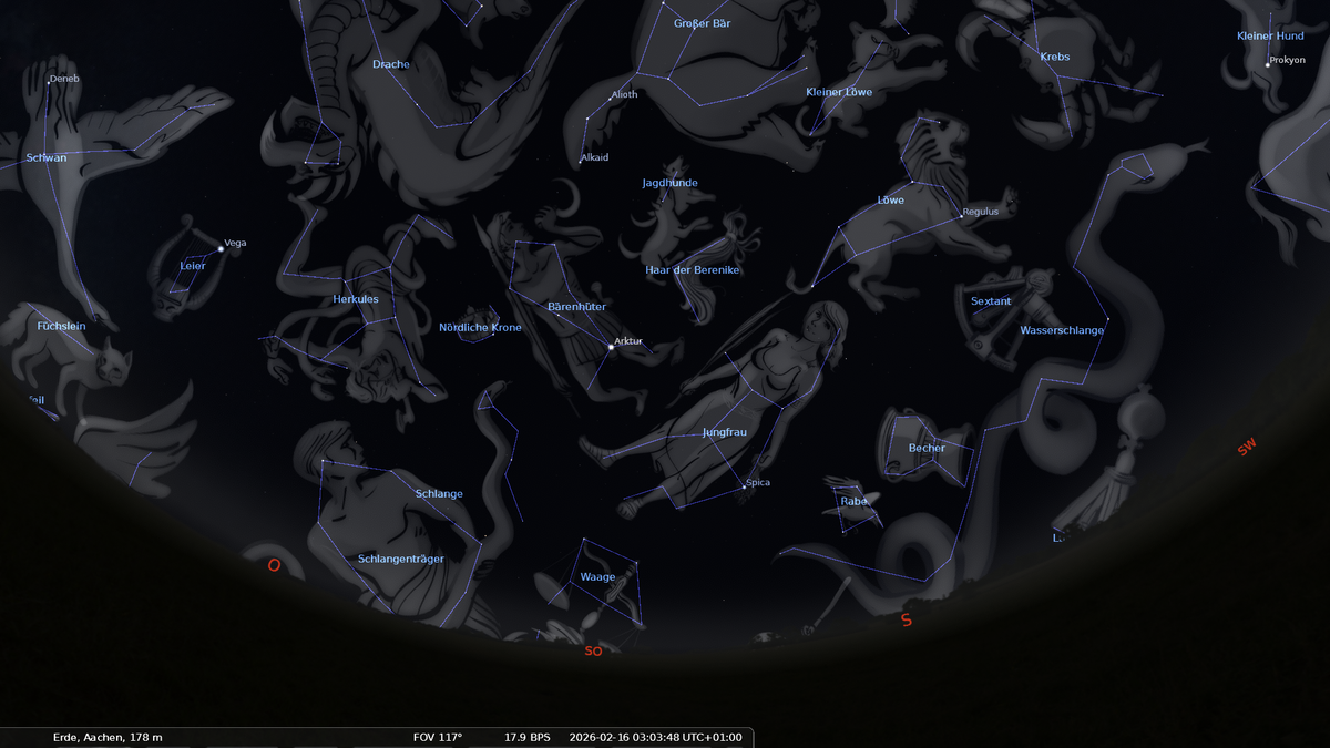 Im Osten sind die Sternbilder Jungfrau und Bärenhüter aufgegangen. Durch die Jungfrau wandert Mitte Februar der abnehmende Mond.