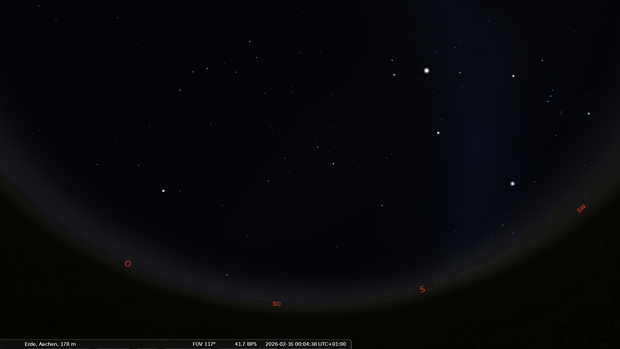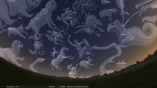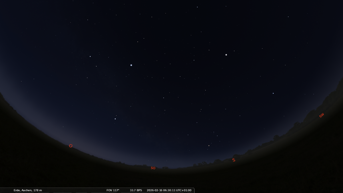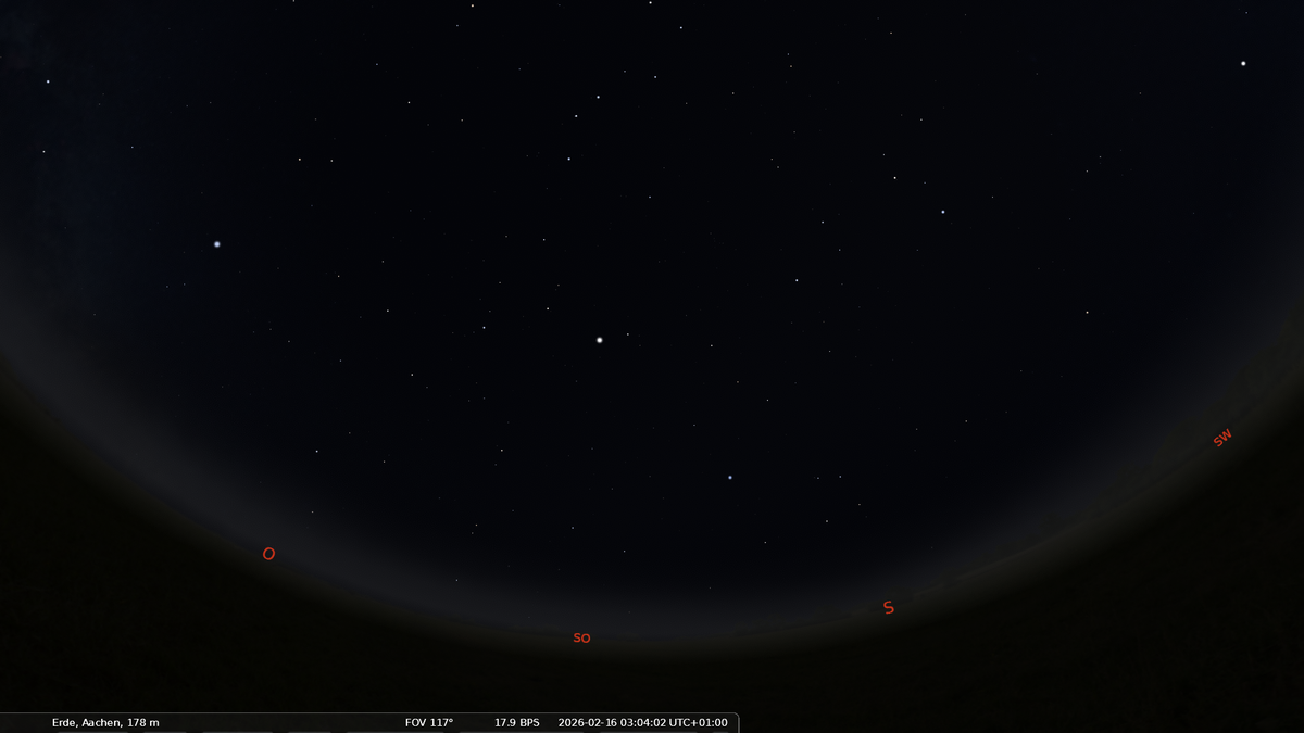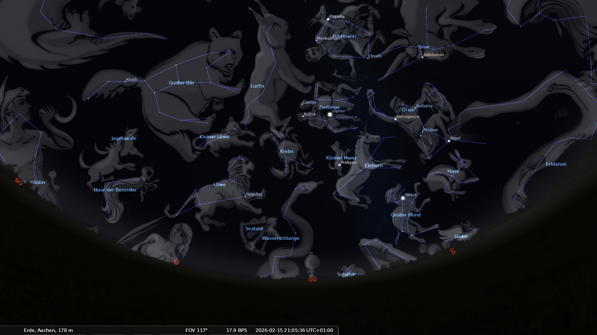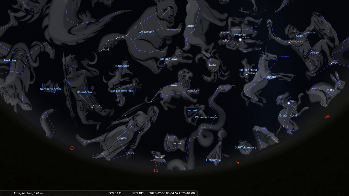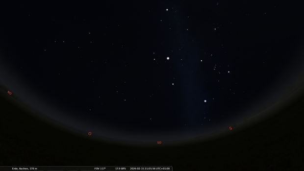 Im Osten ist das Frühjahrsternbild Löwe aufgegangen. Orion und der Große Hund haben ihre höchsten Positionen am Nachthimmel erreicht.