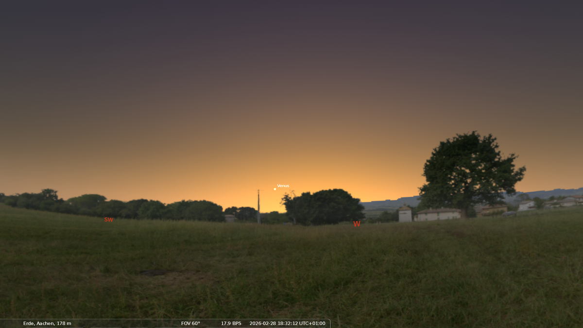 Gegen Ende des Monats taucht der Planet Venus als "Abendstern" nach Sonnenuntergang auf. Die Venus ist in der hellen Abenddämmerung noch nicht auffallend. In den nächsten Monaten entfernt sie sich - von der Erde aus gesehen - weiter von der Sonne und wir besser sichtbar.