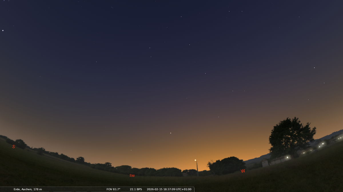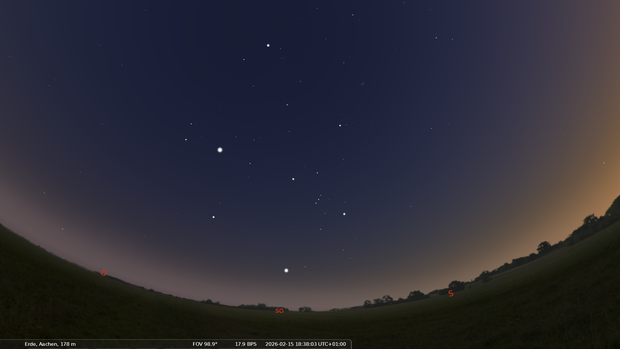 Unterhalb des Saturn ist der Planet Merkur sichtbar. In der hellen Abenddämmerung ist er etwas schwierig auszumachen, mit einem Fernglas ist er jedoch leicht zu finden. Anfang Februar geht Merkur gegen 18.00 Uhr unter, Ende des Monats gegen 19.00 Uhr.