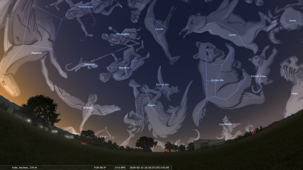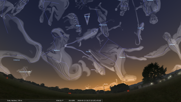 In den Fischen ist der Planet Saturn sichtbar. In den Vormonaten war er mit bloßem Auge gut zu sehen, da er das hellste Objekt in dieser Himmelsgegend ist. Im Februar wird er jedoch - von der Erde aus gesehen - langsam von der Sonne eingeholt und verschwindet in der hellen Dämmerung.