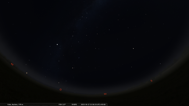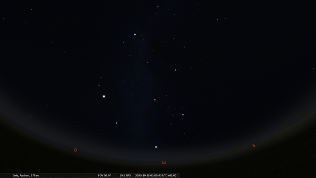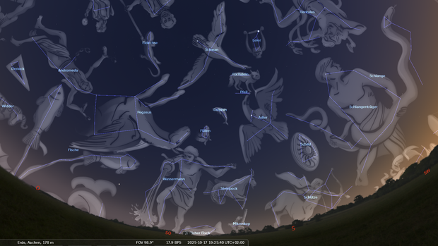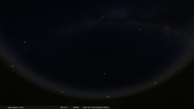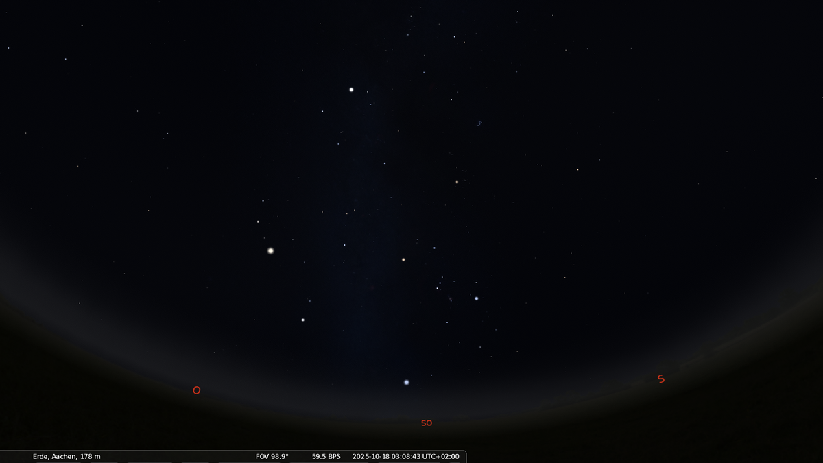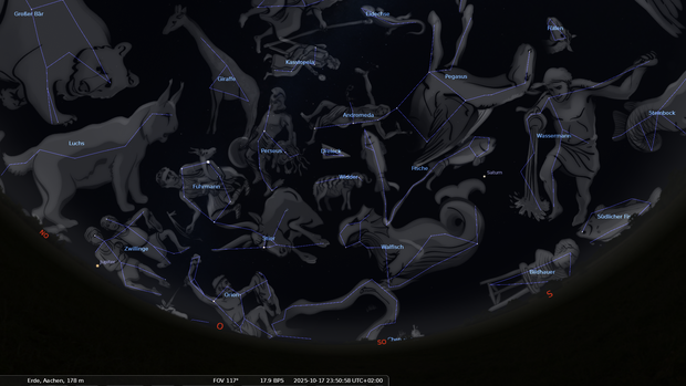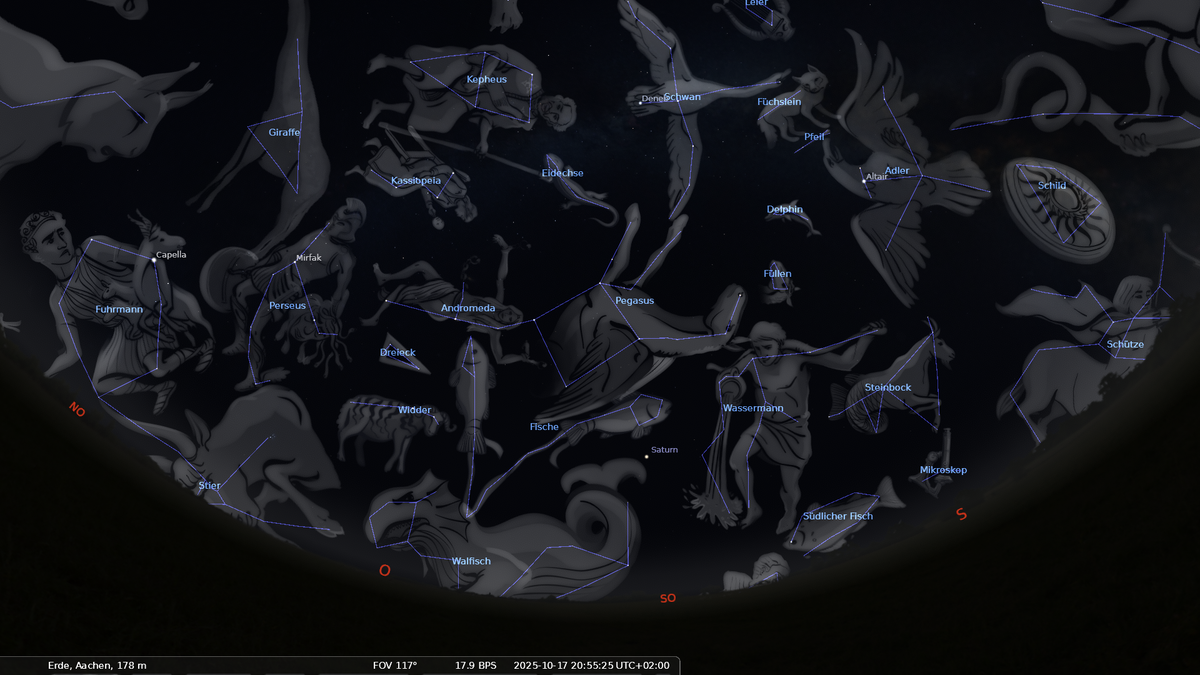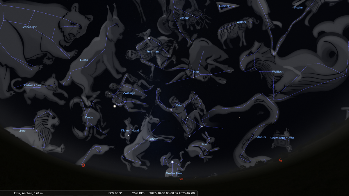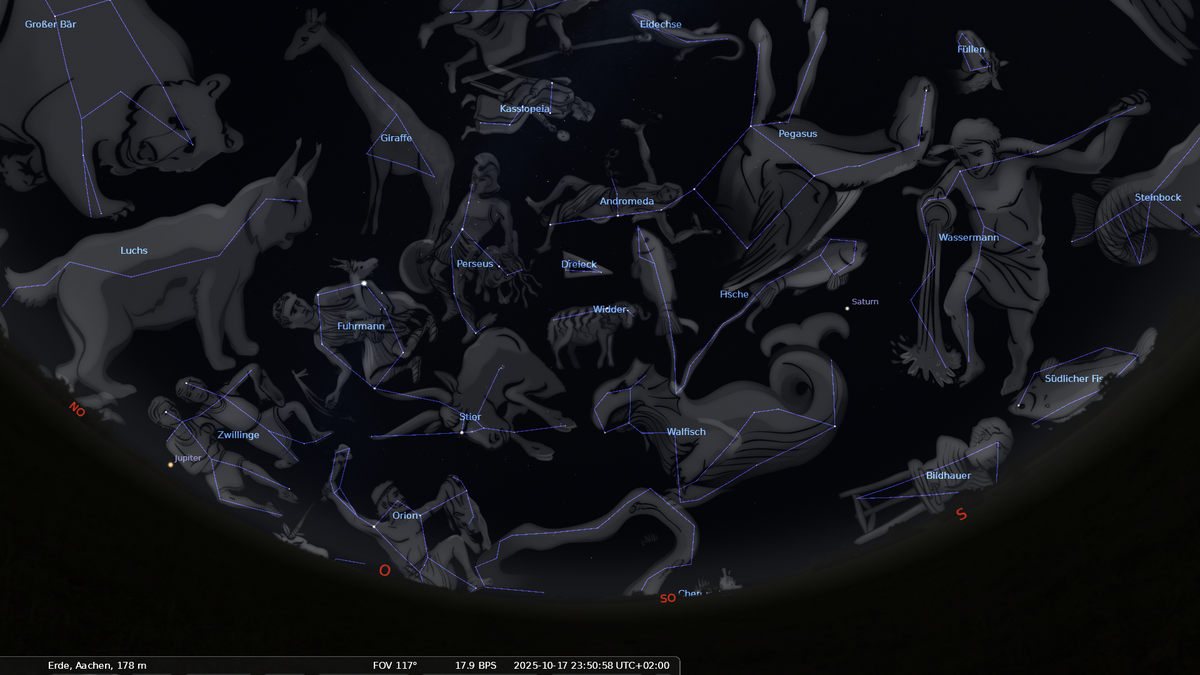 Tief über dem Horizont sind Fische, Walfisch und Widder sichtbar, im Osten geht der Stier auf. An den Stier schließt sich der Fuhrmann mit dem hellen Stern Capella an. Höher am Himmel sehen wir Perseus und Kassiopeia.