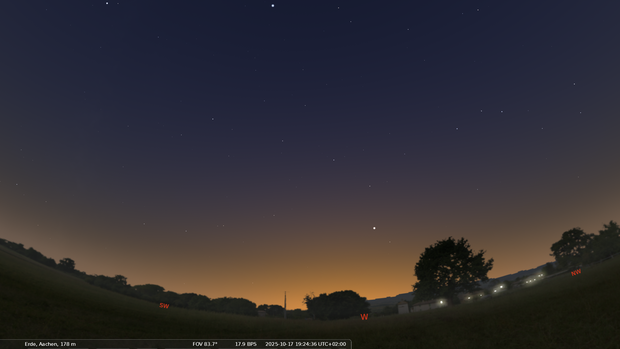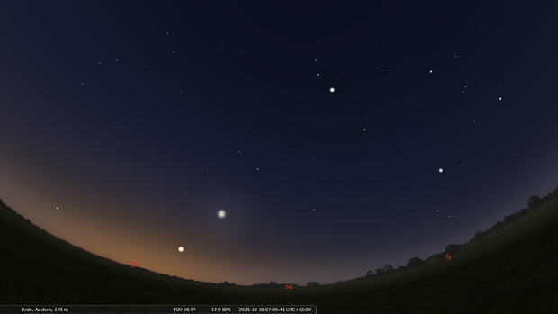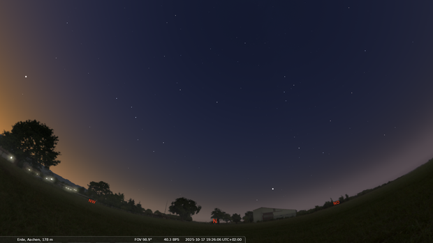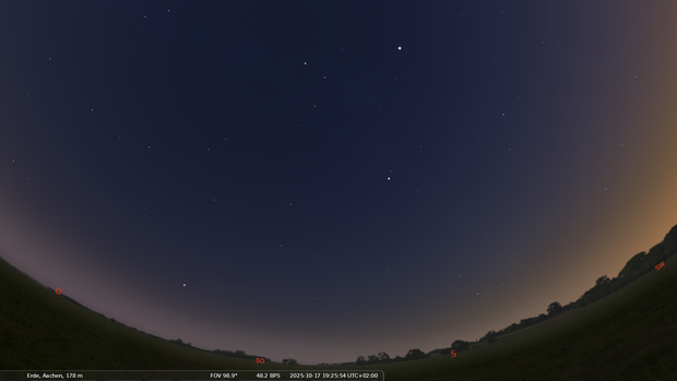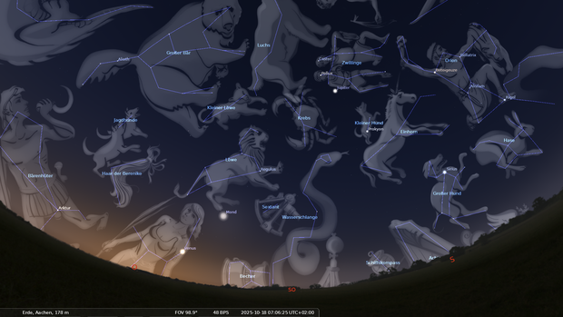 Hier ist eine Übersicht über das Geschehen am Himmel in diesem Monat. Die Darstellungen des Himmels wurden mit der Freeware Stellarium erstellt. Die hoch vergrößerten Aufnahmen der Planeten entstanden am großen Teleskop der Aachener Sternwarte. Durch Klicken auf die Abbildungen werden diese vergrößert.