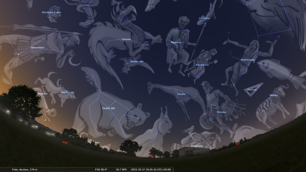 Über dem nordöstlichen Horizont sehen wir Perseus und darüber die Kassiopeia, die wegen ihrer markanten Form auch als das "Himmels-W" bezeichnet wird. Perseus und Kassiopeia sind - wie viele Sternbilder - Gestalten aus der griechischen Mythologie.