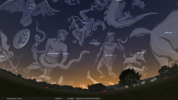 Über dem Horizont stehen Schlangenträger und Herkules.