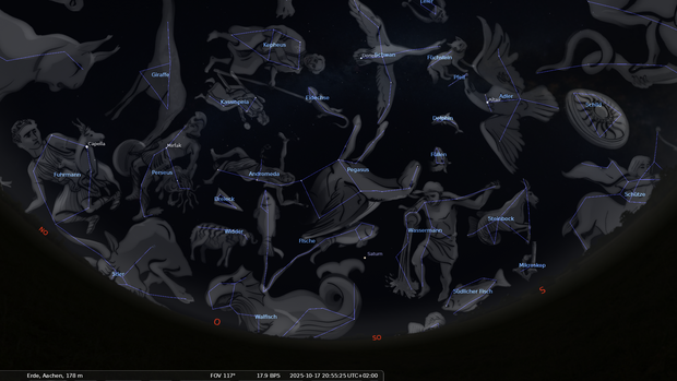 Durch die Fische zieht Planet Saturn. Er ist leicht mit bloßem Auge auszumachen, da er das hellste Objekt in der Umgebung der Fische ist.