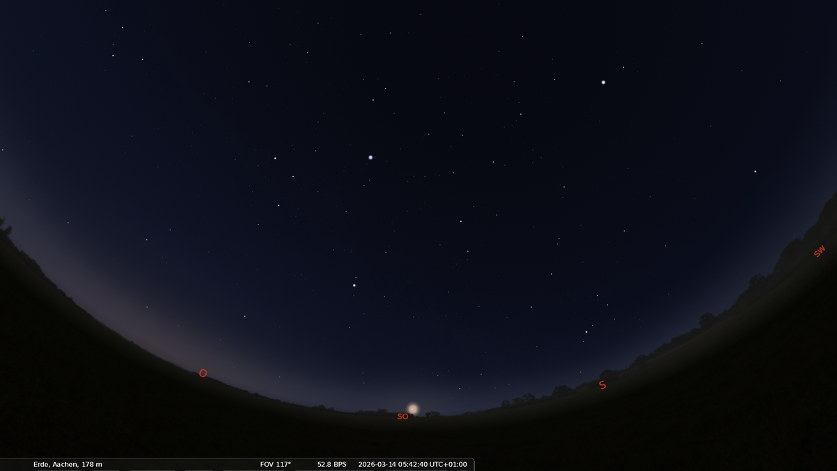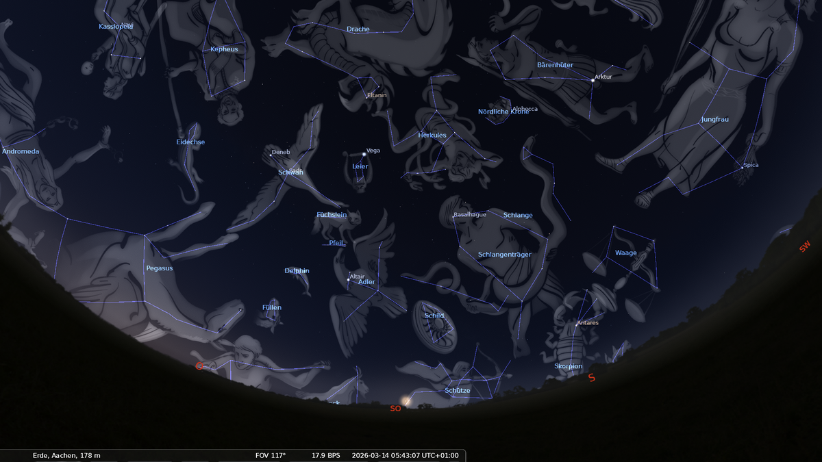 Im Südosten gehen Schütze, Steinbock und Wassermann auf. Am Morgen des 14. Mai sehen wir die Sichel des abnehmenden Mondes im Schützen.