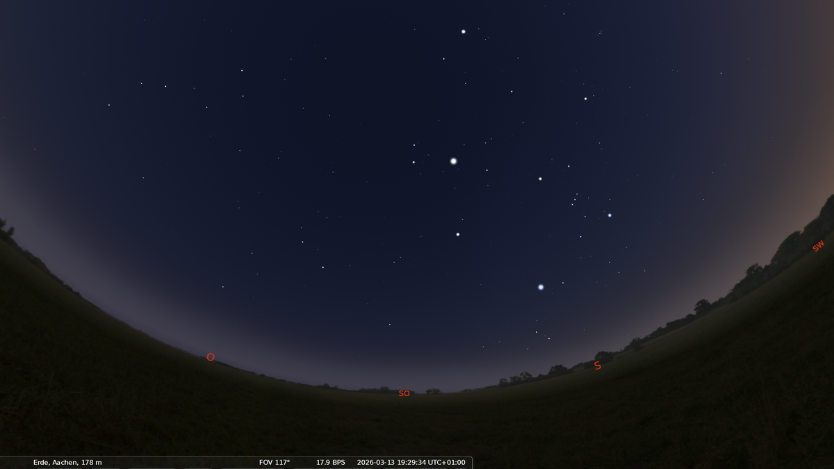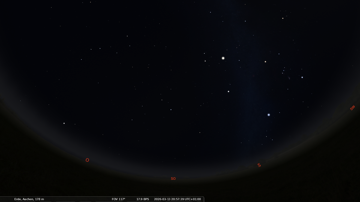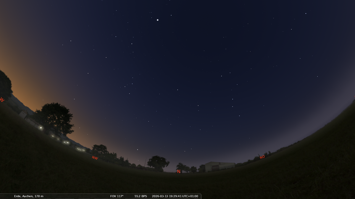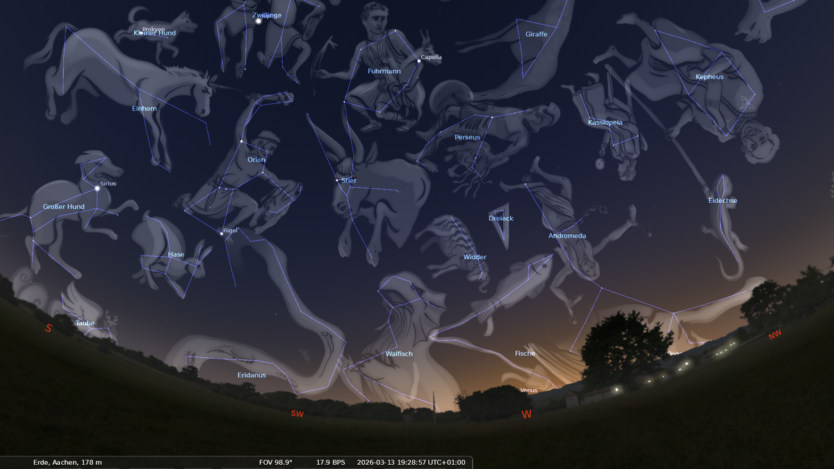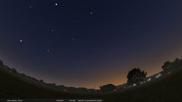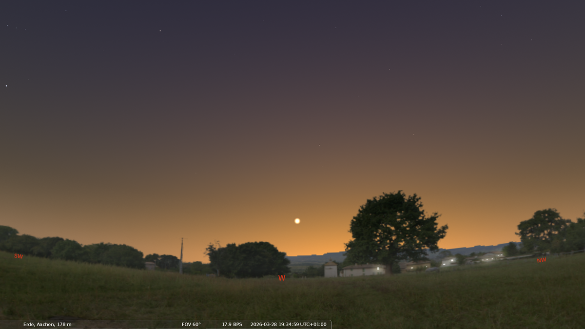 Der Planet Venus wird im Laufe des Monats immer auffälliger. Nach Sonnenuntergang sehen wir sie als hellen "Abendstern" tief über dem westlichen Horizont.