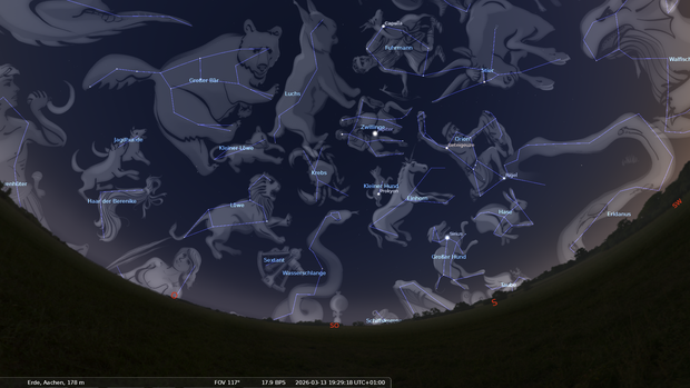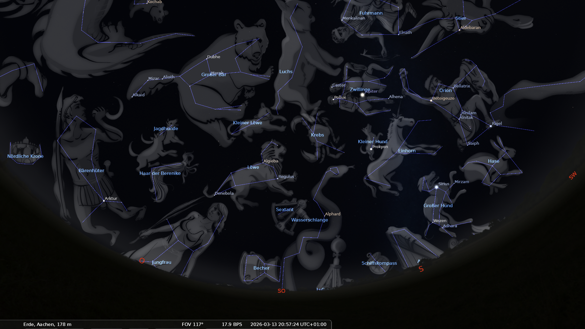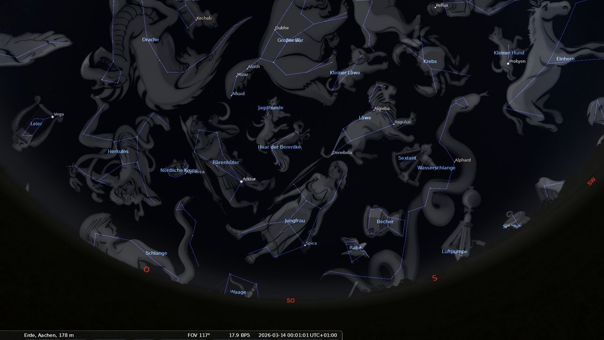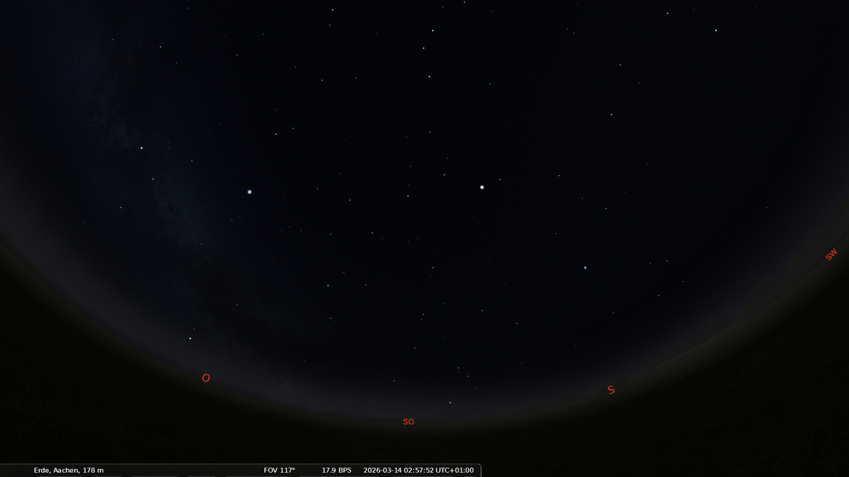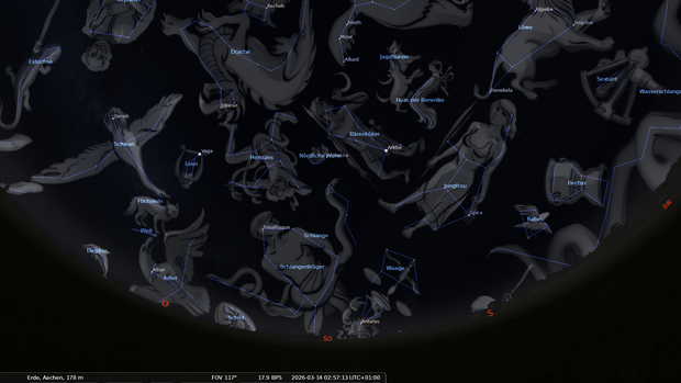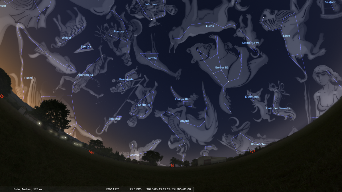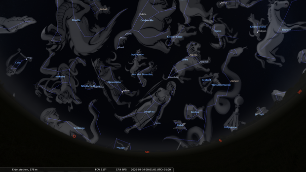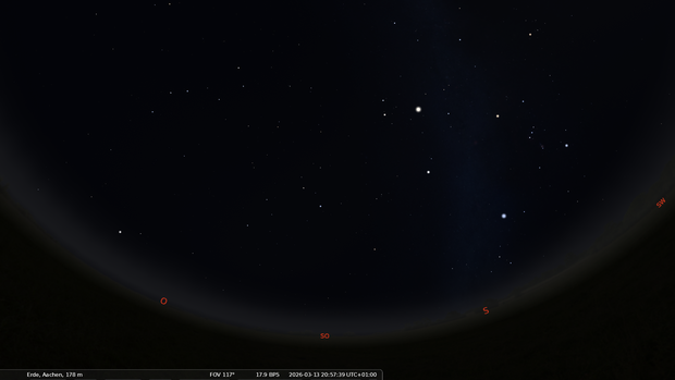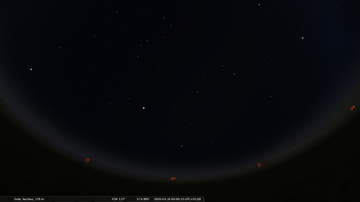 Hier ist eine Übersicht über das Geschehen am Himmel in diesem Monat. Die Darstellungen des Himmels wurden mit der Freeware Stellarium erstellt. Die Fotos der Planeten entstanden an der Sternwarte Aachen. Durch Klicken auf die Abbildungen werden diese vergrößert.