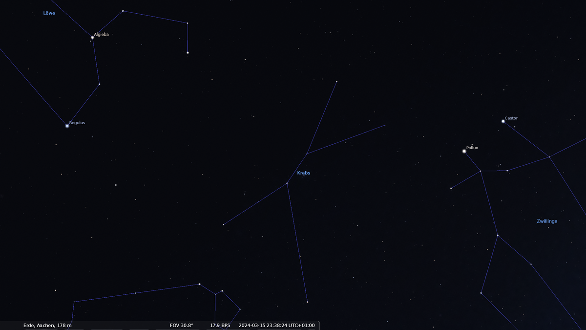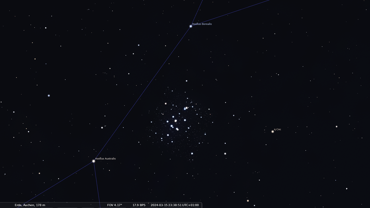Im Krebs finden wir einen wunderschönen Offenen Sternhaufen, der den Namen Praesepe (lateinisch: Krippe) erhalten hat. Eine weitere Bezeichnung ist "Bienenkorb".