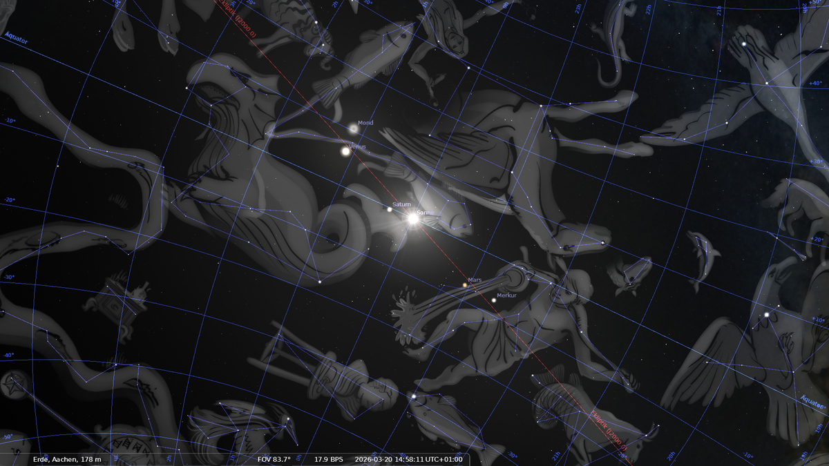 Am 20. März ist Frühjahrs- Tagundnachtgleiche. Die Sonne geht an diesem Tag exakt im Osten auf und im Westen unter. Überall auf der Erde sind Tag und Nacht gleich lang. Die Sonne überschreitet an diesem Tag den Himmelsäquator im Sternbild Fische und wechselt in den nördlichen Teil der "Himmelskugel".