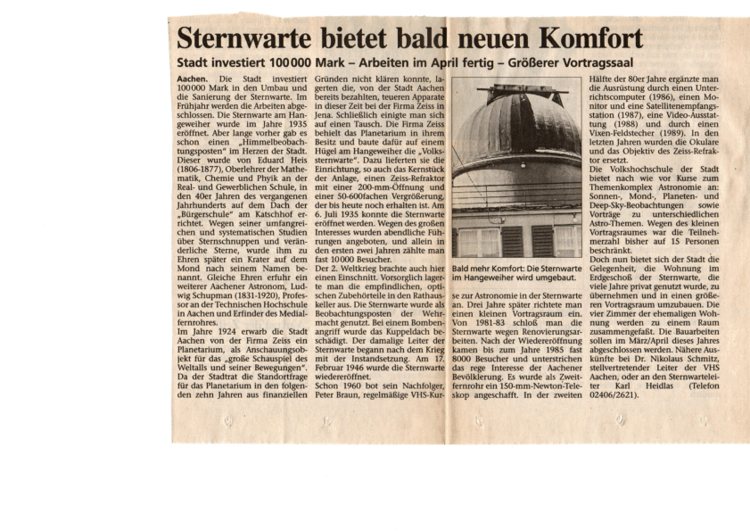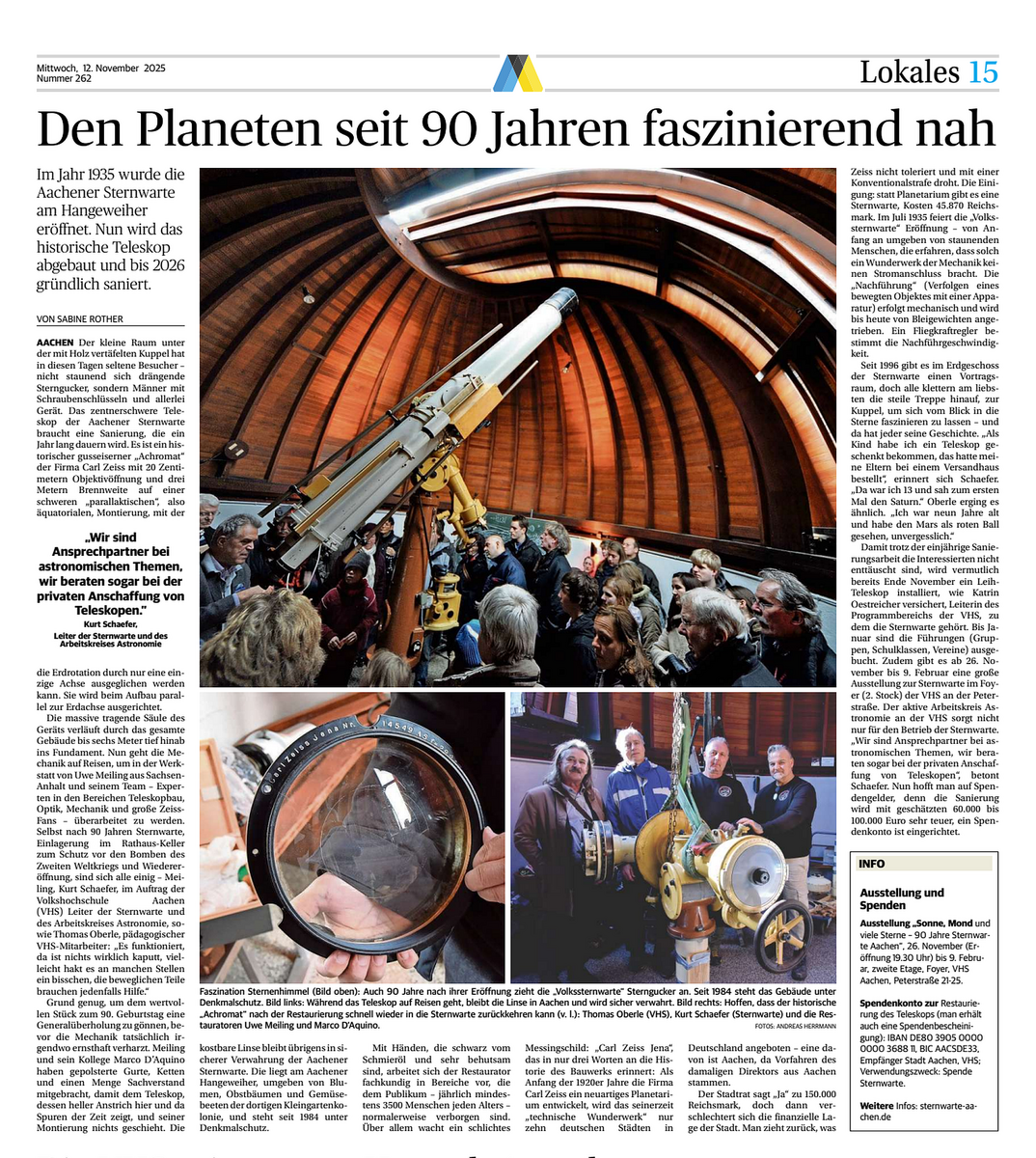 Aachener Zeitung vom 12.11.2025, Restaurierung des Teleskops