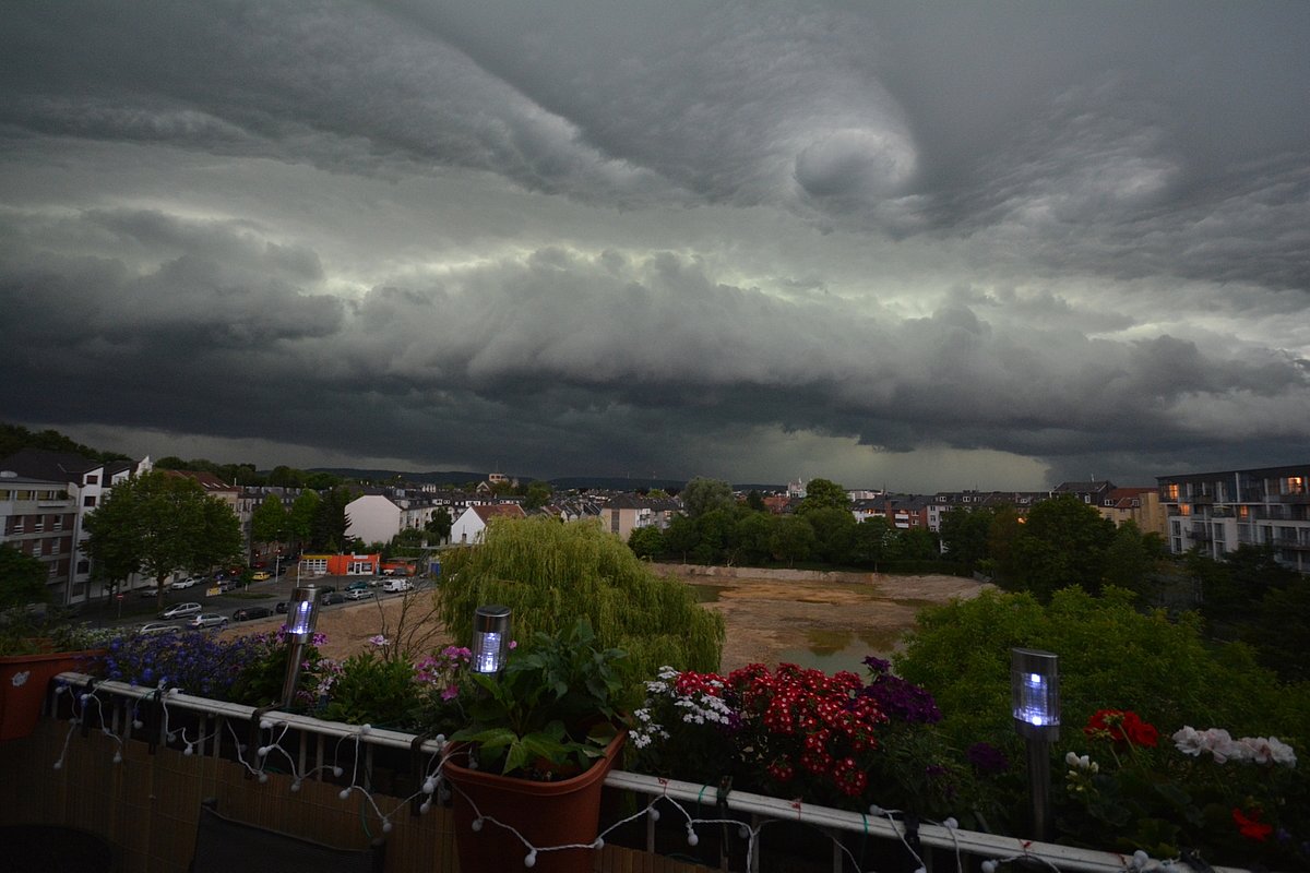 Das Unwetter kündigte sich abends über Aachen durch ausgeprägte "Mammatus"-Wolken an. Diese beutelförmigen Wolken bilden sich meist an der Unterseite von Amboss-Gewitterwolken (Cumulonimbus) aus.
